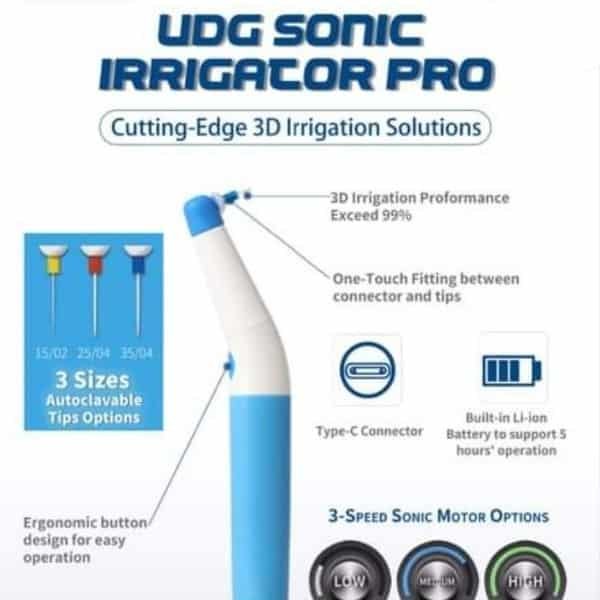 - Ultrasonic Activation: The UDG Sonic Pro harnesses the power of ultrasonic technology to activate root canal irrigants thoroughly. This ultrasonic activation enhances the penetration and efficacy of irrigants in complex canal anatomies.